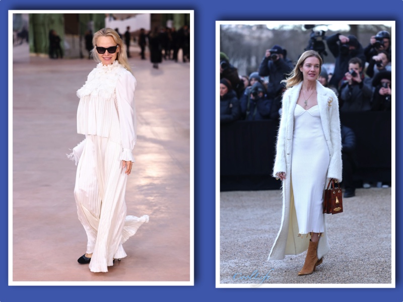 Pamela Anderson camino al desfile de Chanel haute couture printemps-été 2025 y Natalia Vodianova en el desfile de Schiaparelli haute couture printemps-été 2025.